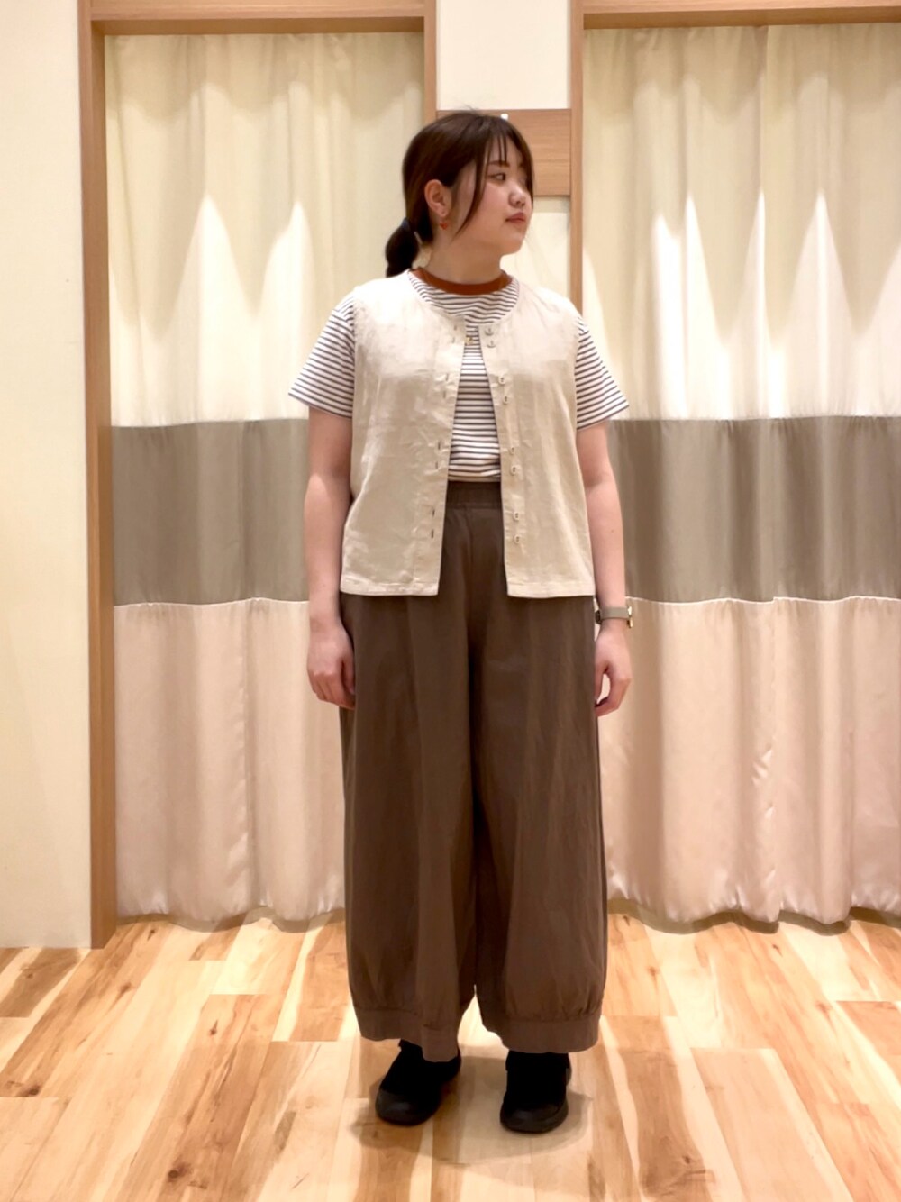 明日よりノベルティフェア&GWフェア開催です💐 お近くの際はぜひ立ち寄ってみてください👒 ボリュームあるパンツに シンプルなベストを組み合わせてみました💐 インナーのボーダーTシャツは カラーリングが優しくて、 ボーダーの主張がさり気ないのが可愛いです✨
