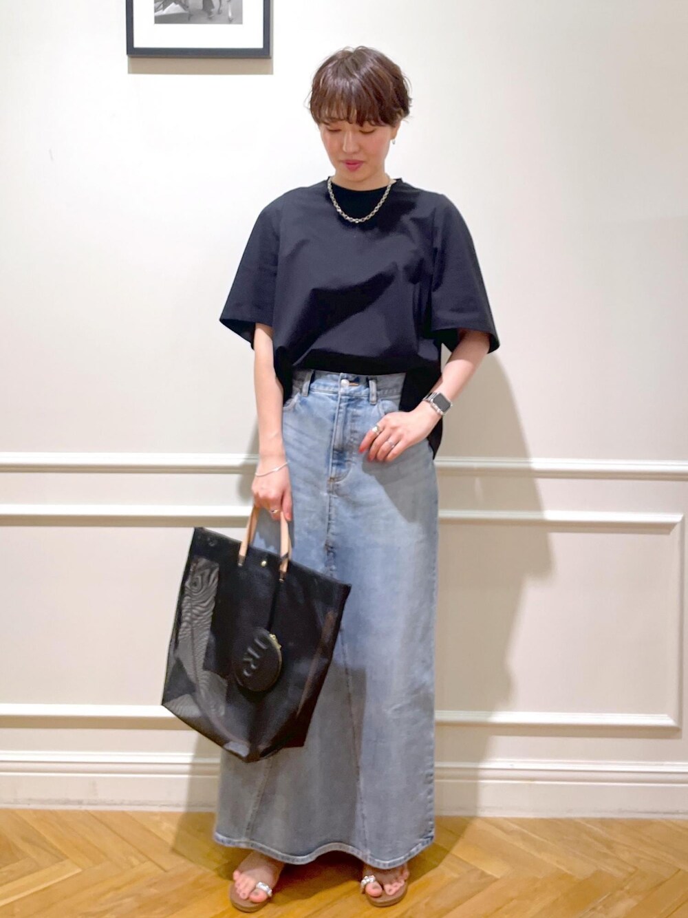 一見シンプル&カジュアルだけど、こなれ感のあるスタイリングです。 三尋木さんの大人きれいめTシャツは、目の詰まった編み地で張り感があり、ベルスリーブのアクセントがさり気なくオシャレを演出して普通のTシャツコーデと差をつけられます♪ もちろんそれだけでも完成度は高いですが、個人的にはアクセサリーをプラスしてあげると、もっとオシャレ感がUPするのでオススメです◎