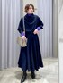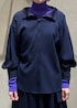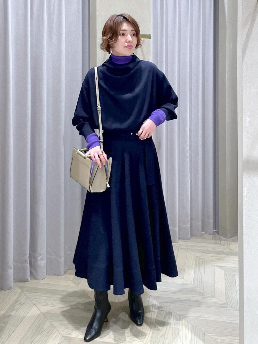 毎年三尋木さんコラボのセットアップはリアルバイしています♪ ブラウス・スカートとそれぞれ単体でも他のアイテムと合わせやすいですが、セットアップだとワンピース風に♪ 綺麗めになりすぎないように、今回はカラーが際立つパープルのタートルを入れてみました。 一癖でることで更に完成度UP!! ジョーゼット素材なのでツヤもあり高級感がありますので、お呼ばれにも◎ ブラウスは前後2WAYで片方は前開きですので、軽い羽織としても活用できます。