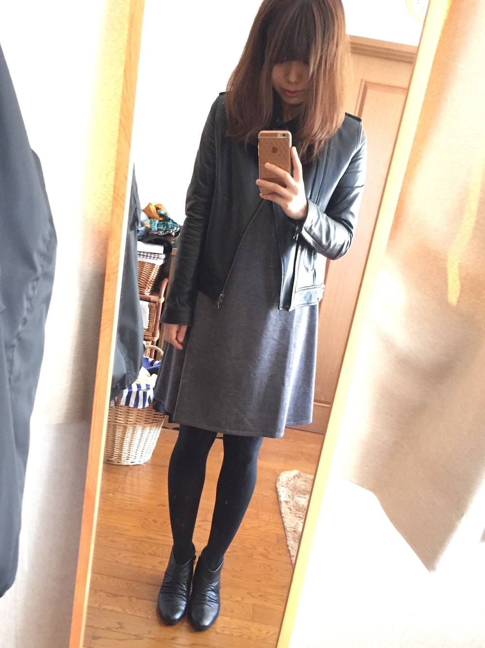 ブラック系のライダースジャケットを着用したレディースの秋コーディネートの1枚目の写真