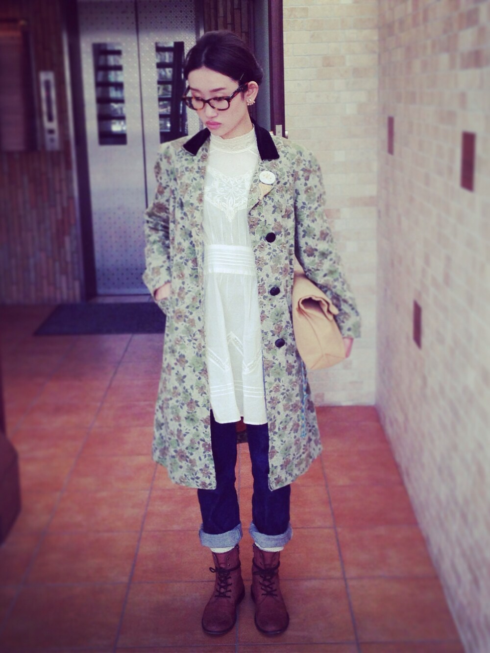 アウター‥古着 刺繍チュニック‥セレクトショップ デニム‥無印 編み上げブーツ‥スタディオクリップ メガネ‥nacky made ブローチ‥ミナペルホネン