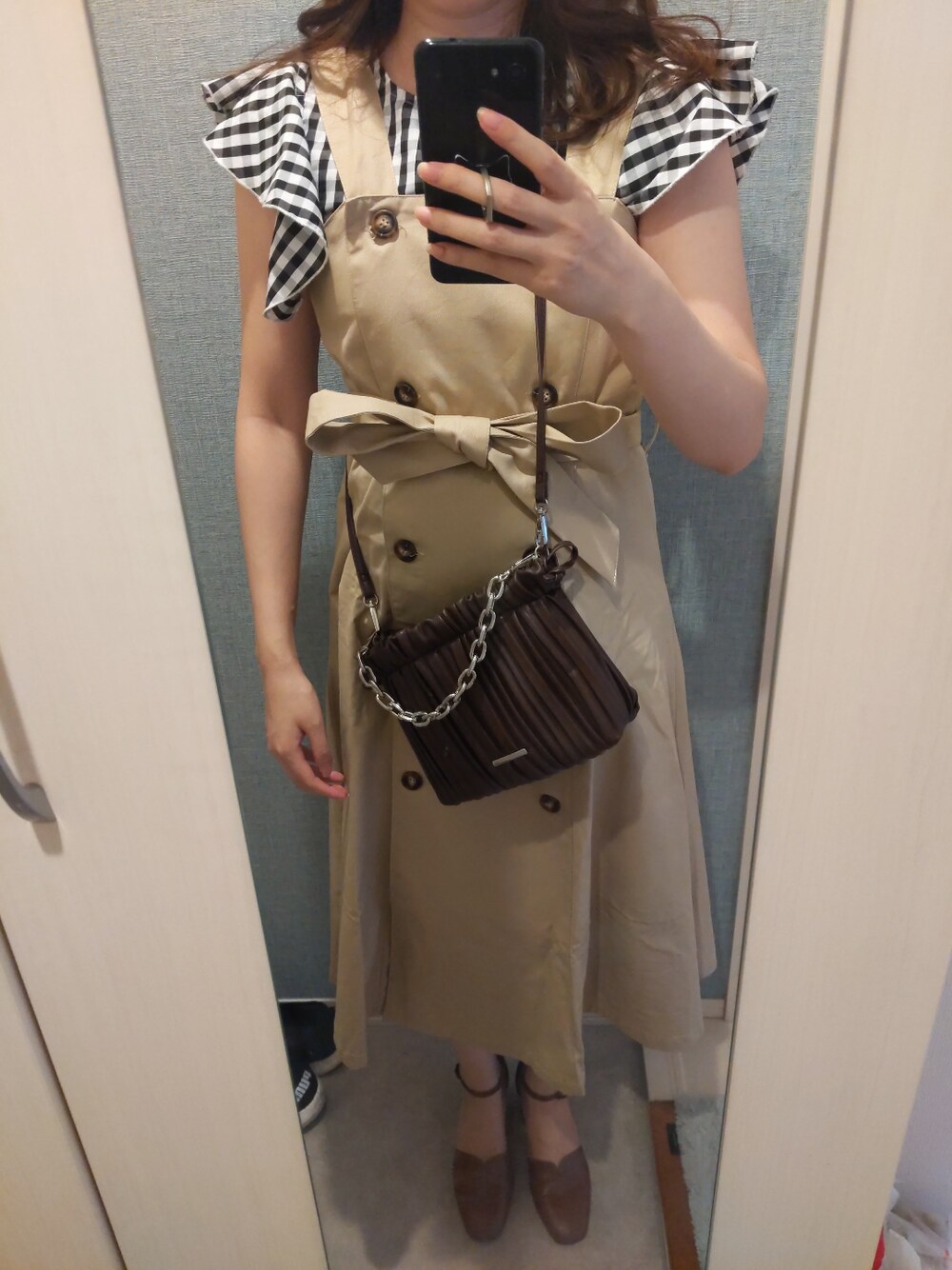 甘めのギンガムチェックのトップスとトレンチワンピースを合わせたコーデです。 全身プチプラです