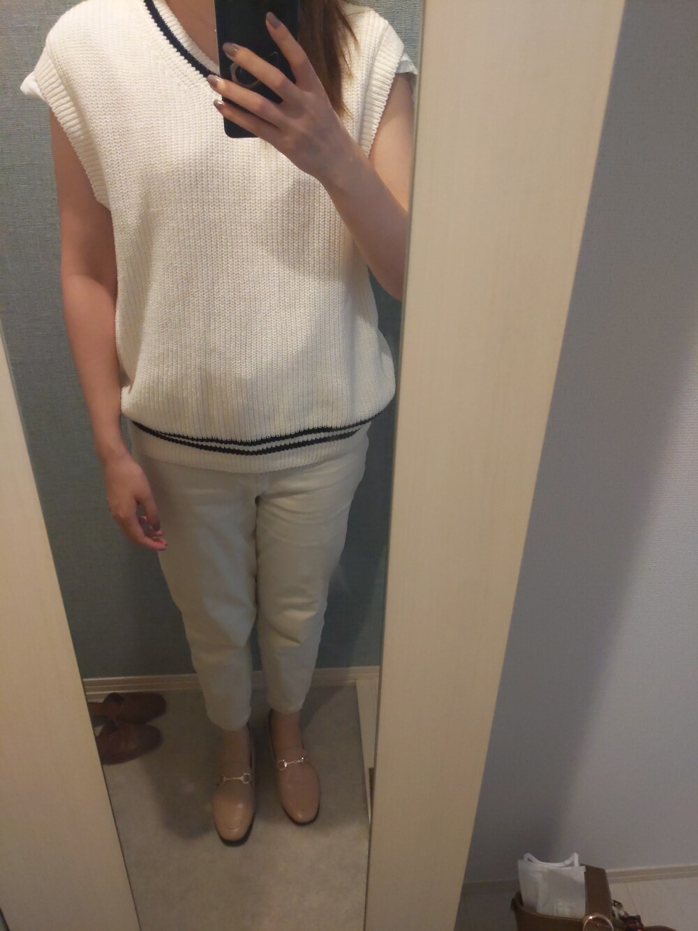ユニクロの白Tシャツの上にベストを重ね着して白いパンツとあわせたコーデです 全身プチプラです😊