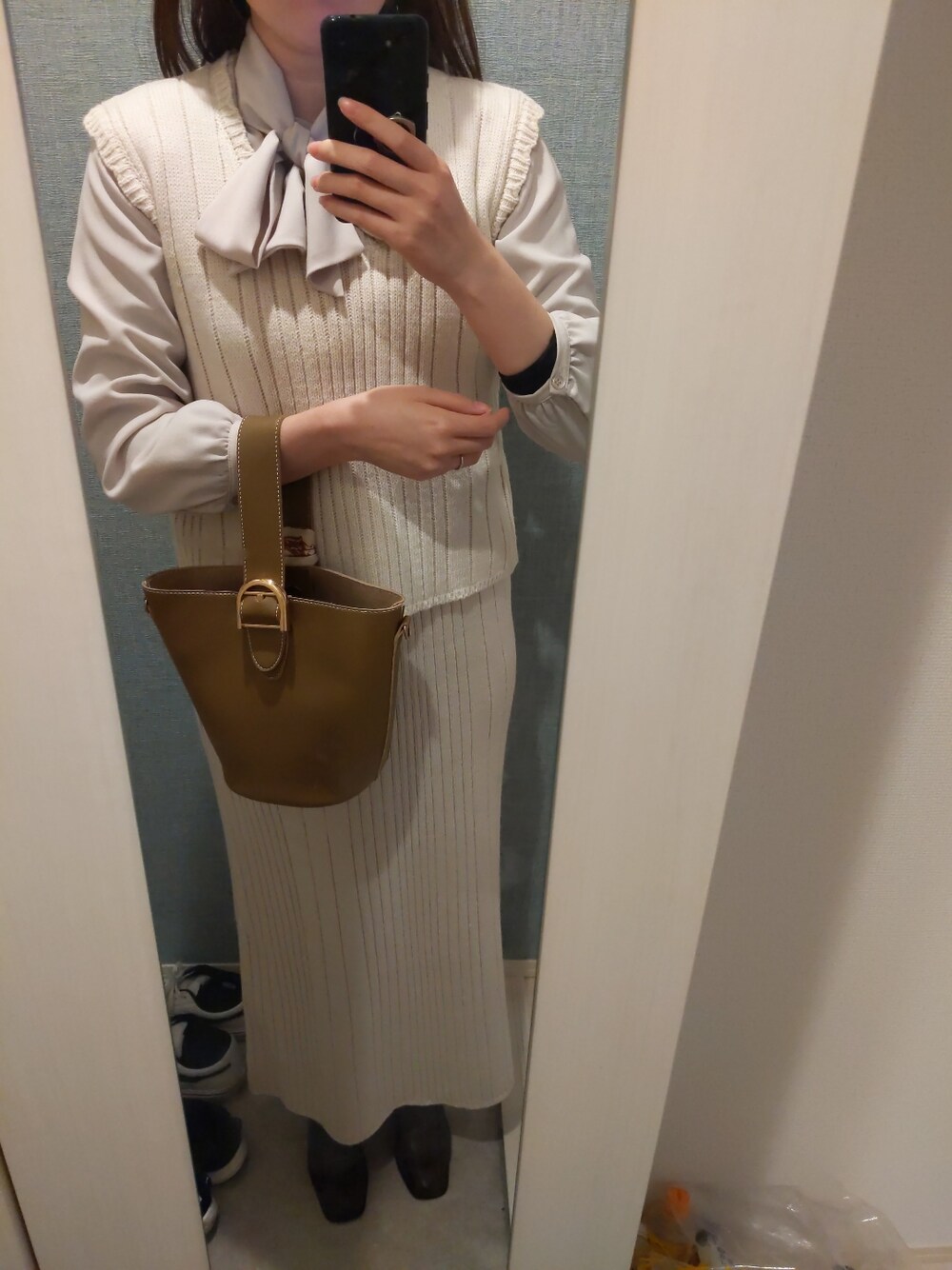 ニットのベストのしたにブラウスその中にヒートテックを重ね着しています 全身プチプラです😊