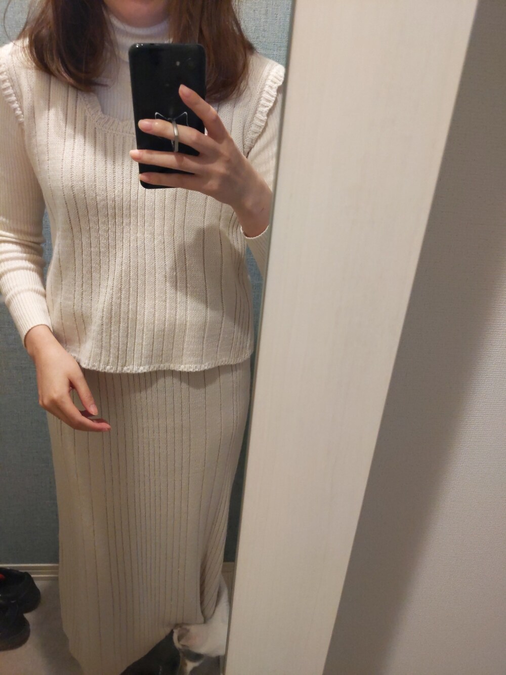 タートルネックにニットのベストとセットアップのスカートを合わせたコーデです😊 ダウンベストはモコアズ バッグはグレイルです!