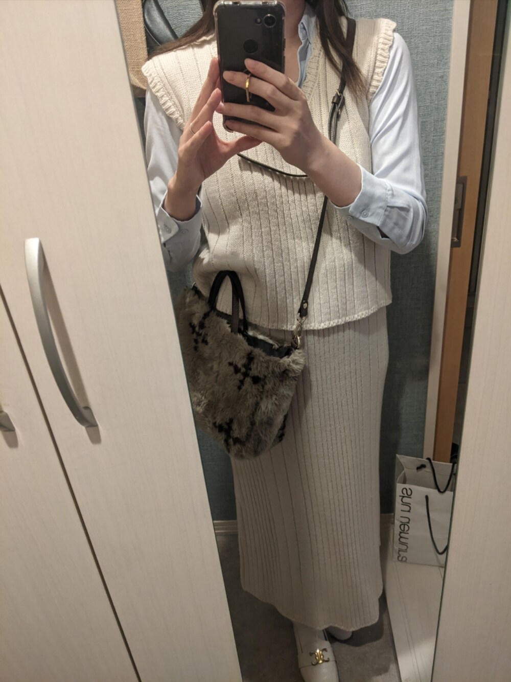 ニットのベストにシャツを合わせたコーデになります。 少し荷物があったのでお気に入りのrussetのバッグに合わせました 白いローファーはgrlです