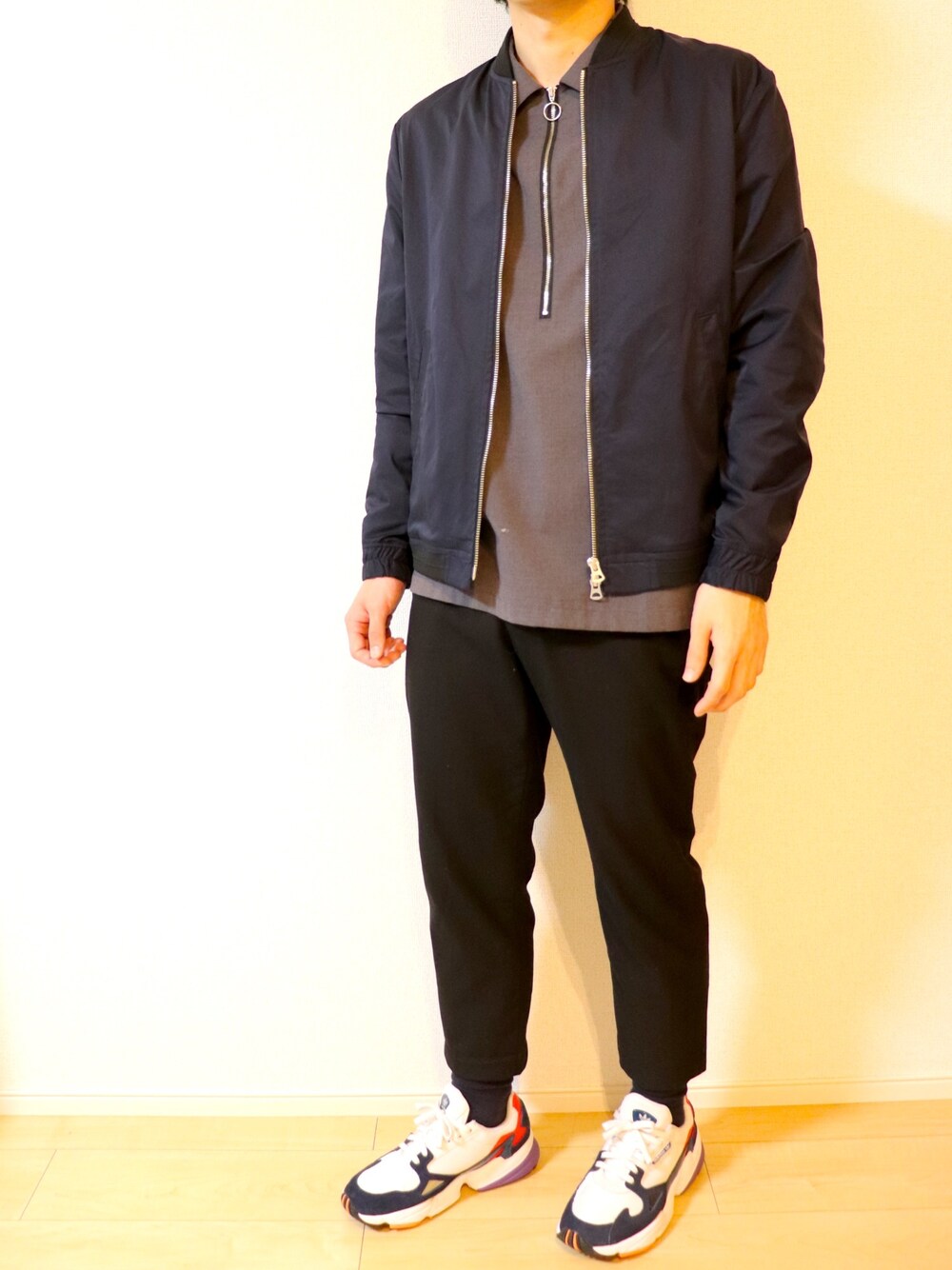 【NO.10】MA-1(ネイビー) × 黒スラックス × ダッドスニーカー(カラフル)のコーデ🤣