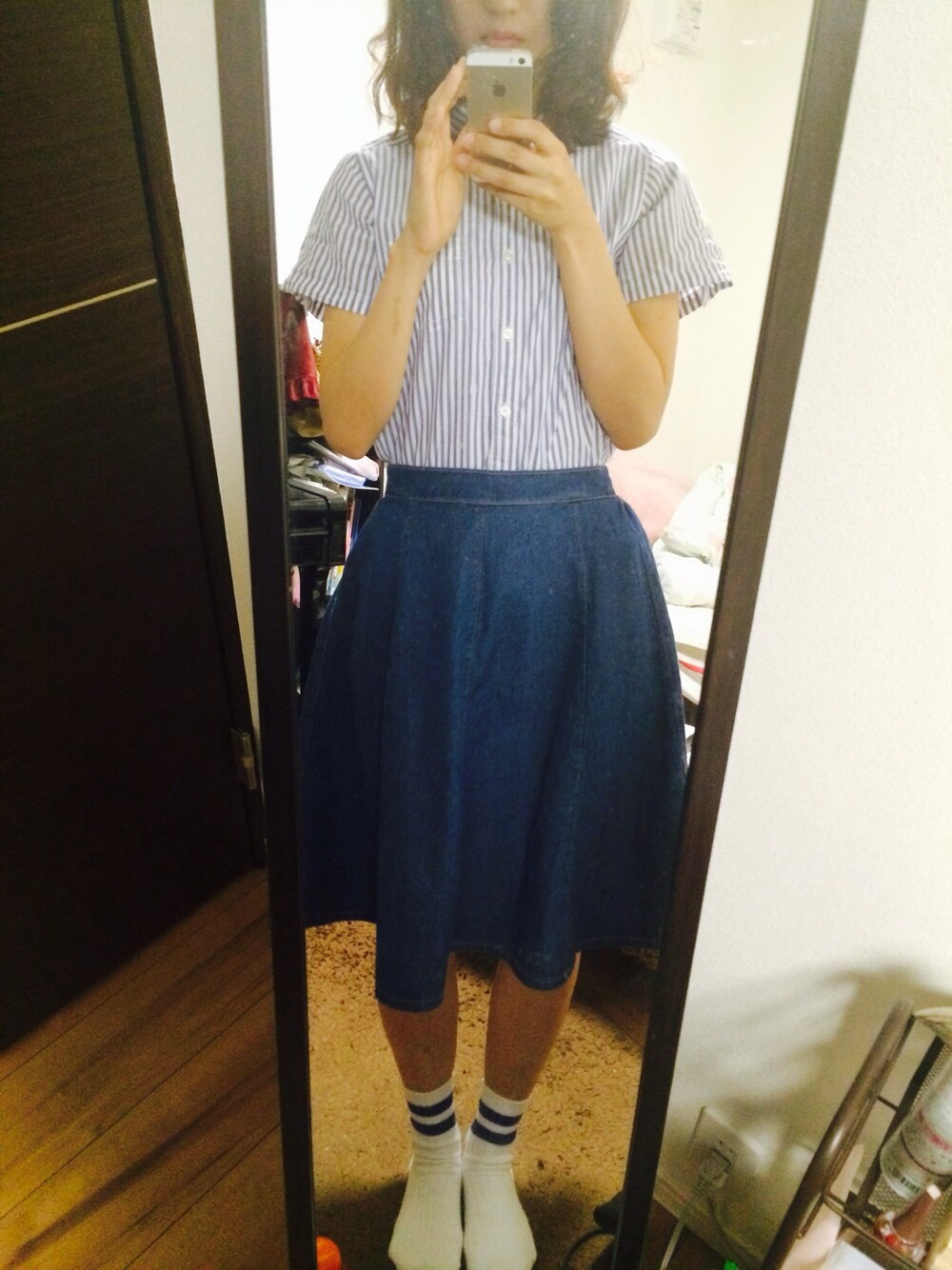 ブルー系のシャツ/ブラウスを着用したレディースの春コーディネートの1枚目の写真