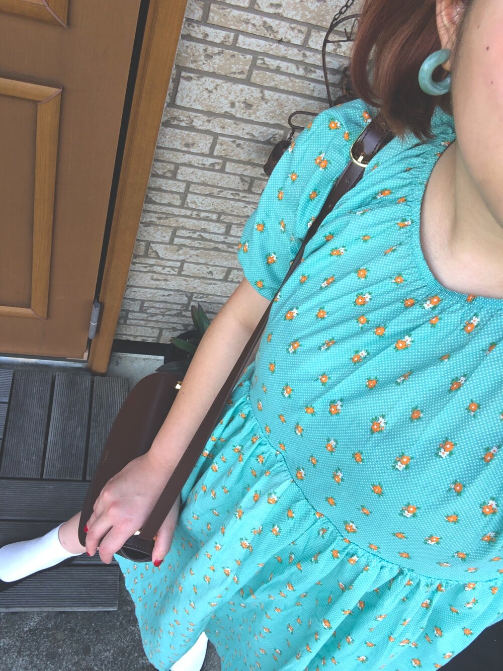 韓国の通販で買ったワンピース♡ ドットに小花柄でレトロて可愛いくてお気に入り(っ・ω・)っ♡ ピアスと色を合わせて統一感を出したよ!