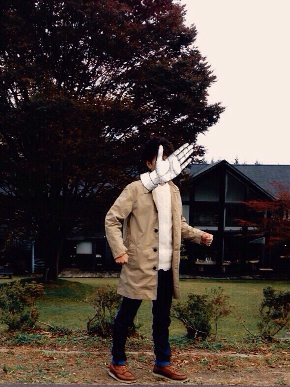 前のコーデに ブーツ履いて ステンカラーコートを着た WEARパクリファッションThe best ポーズがナゾ