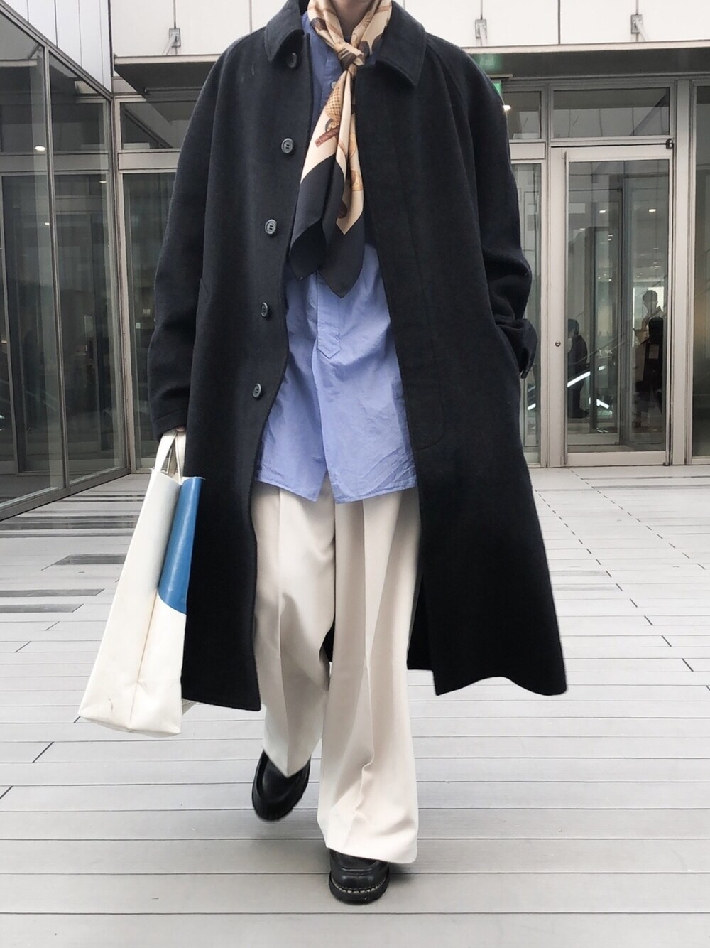 スカーフ巻いて差別化を マイブームは青かもしれない笑 コートはMOSCHINO スカーフは古着屋さんで2000円くらいで買いました🙂
