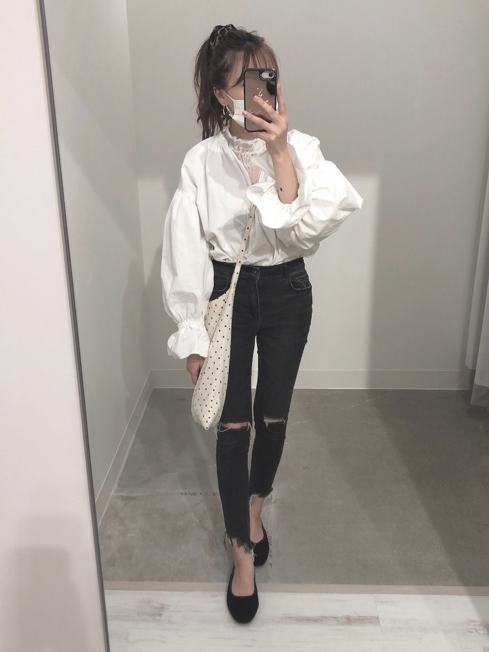 レースのハイネックを合わせたよ🤍🤎🤍 トートバッグはハンドメイドしたもの🌿