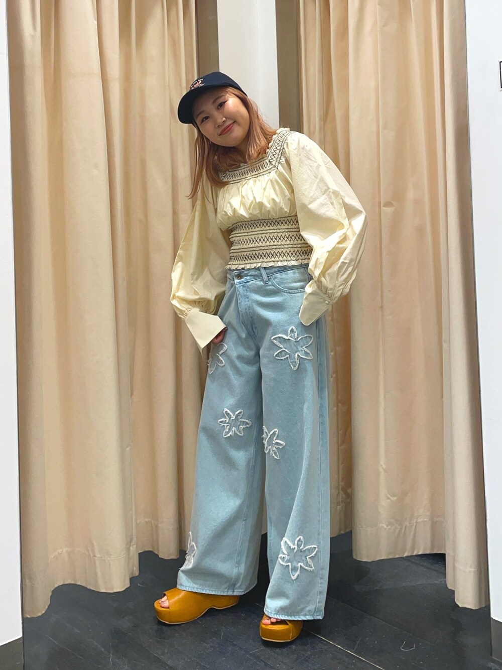 オフショルにもなるブラウス🍒 デニム合わせで大人カジュアルに! お花が可愛いデニムは Mサイズでウエストひとつ ベルトのところに引っ掛けてボタン止めて 履いてます👍