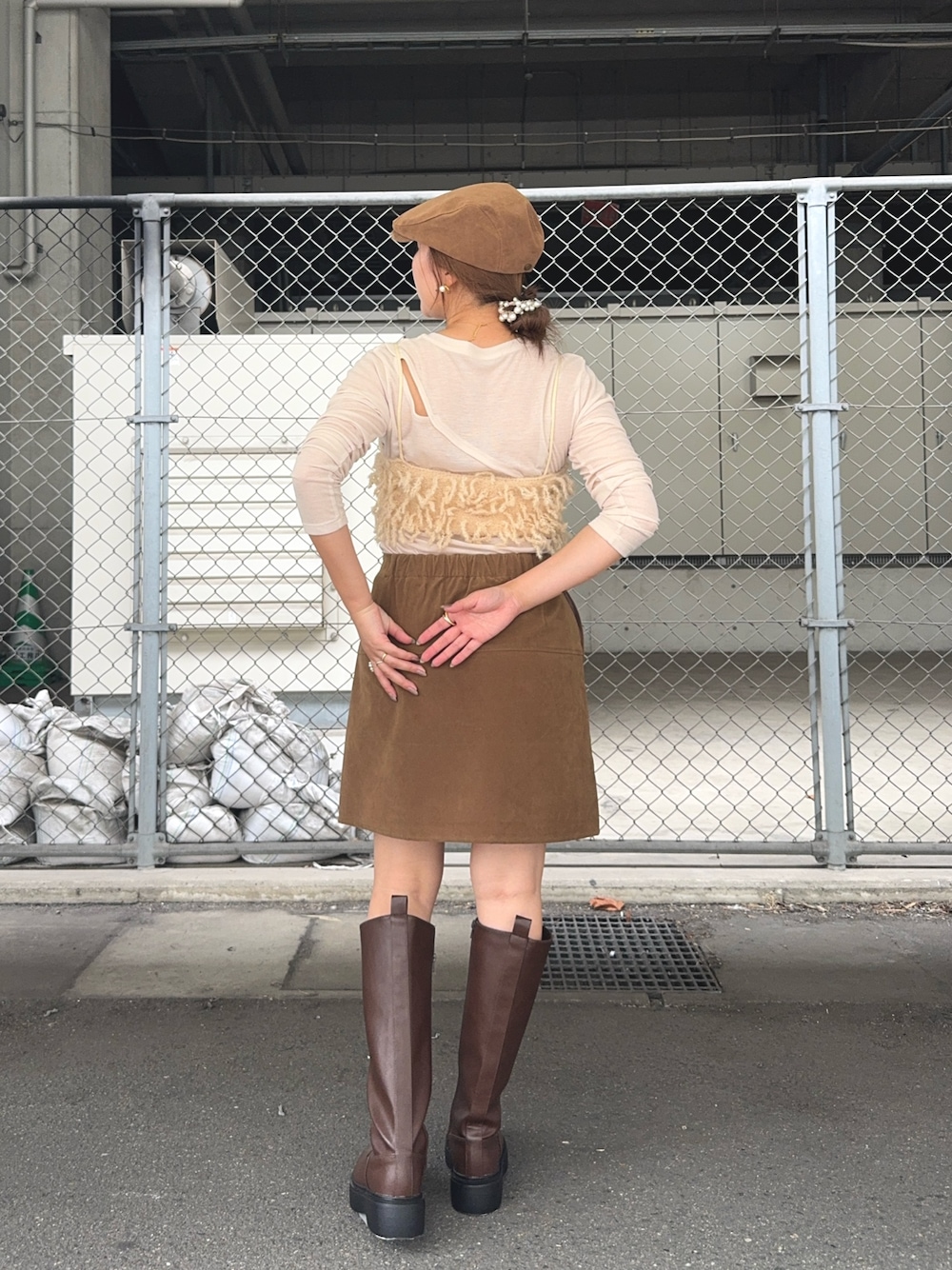 スウェードは今年マストアイテム! このビスチェも可愛い🫶 ハンチングは今年っぽい🤠