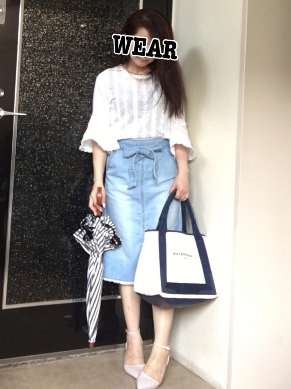 いつもご覧くださりありがとうございます😊 ◇2018/06/13のコーデ◇ GU GIRLSのウエストリボンデニムスカート BALENCIAGAのバッグ fluneのアンクルストラップパンプス サンバリアの日傘 髪の毛がボサボサで失礼します😓 暑い季節はライトブルーのデニムがやっぱり爽やか😆✨ ストライプの日傘もお気に入り❣️