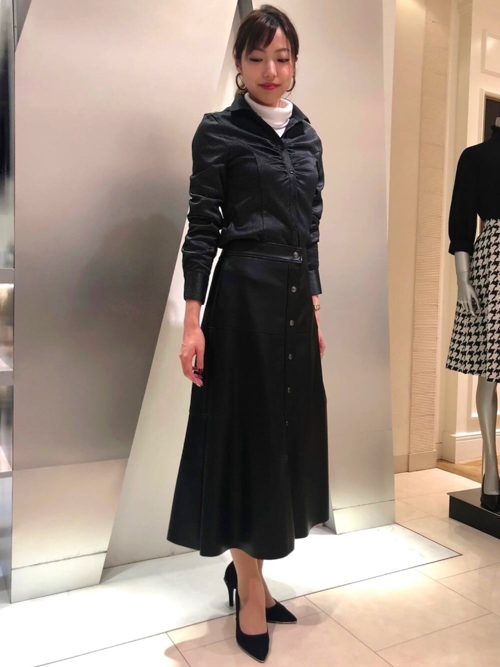 シャツ×タートルで一気に秋感アップ🍁ストレッチの効いたシャツはさりげない千鳥柄でカッコいいですよ😊 ブラウス 10-92-01-028 スカート 30-92-08-928 カットソー 30-92-31-908