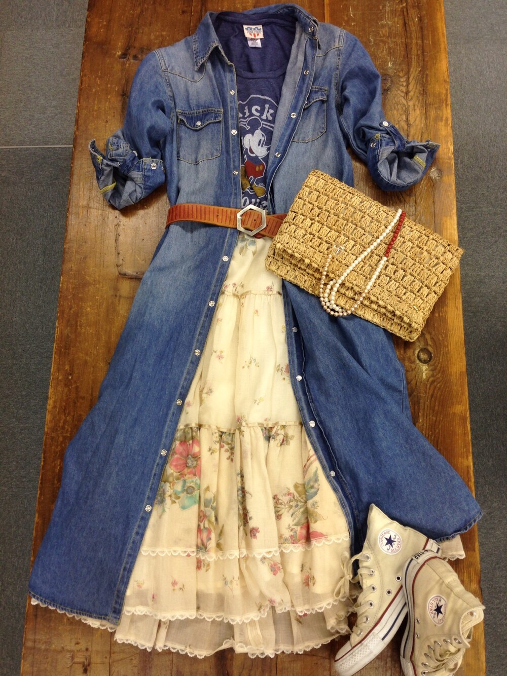 キャラT!!やっぱりMYCKEYでしょ★ 古着のスカートと羽織りにデニムワンピを合わせてみました。 古着。めちゃめちゃかわいい(≧∇≦) いろんなとこ駆け回って見つけた時はめちゃめちゃ嬉しいですよね★ でも最近いい場所見つけました!! よく愛用のAUNT MARIE'Sに古着も置いてありました!! 1点物セレクト★ テンション↑↑ TはJUNK FOOD。