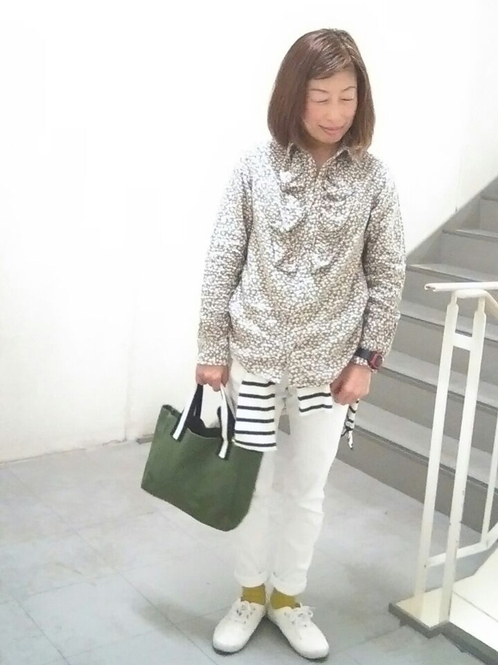 ひろちゃさん主催のお花見祭りに 参加させていただきます♪♪ 風邪ぎみのため、お花見とはいかず 花柄のシャツを仕事に着て行って 仕事終わってからのパシャり💦 花柄に黄色が入ってるので靴下を合わせて 葉っぱっぽい緑のトートをアクセントに🌷 ギリギリになってしまい ごめんなさいf^_^;)
