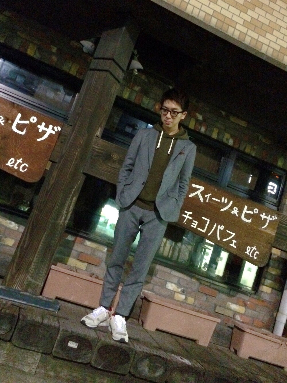 地元のOBで撮りました!笑 起毛感があるスーツをスポーティーな感じに着崩してみました! 今日はあまり寒くならなかったから、若干暑かった....苦笑い