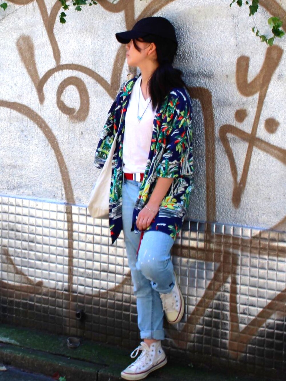 吉祥寺の路地で撮ってもらいました📷 お気に入りの古着屋さんtopofthehillのアロハシャツ🐠🌺
