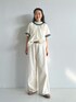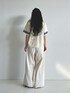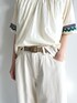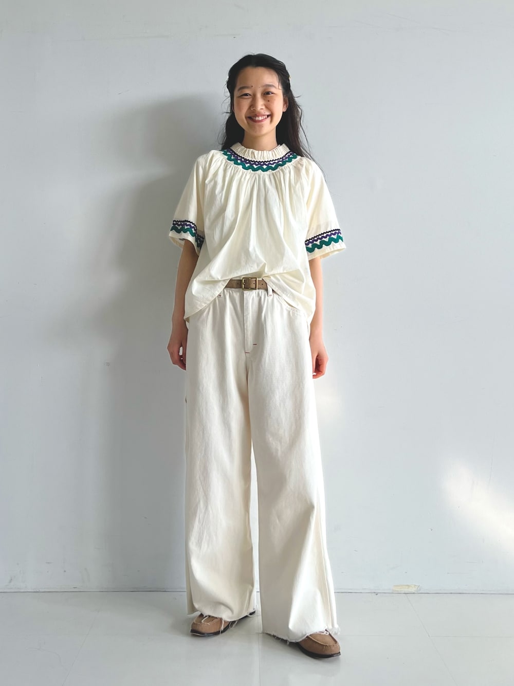 テープギャザースモックを1枚で着ています。カラフルなテープが魅力的だったので、パンツはホワイトを選び、落ち着いたカラーの小物でまとめました。