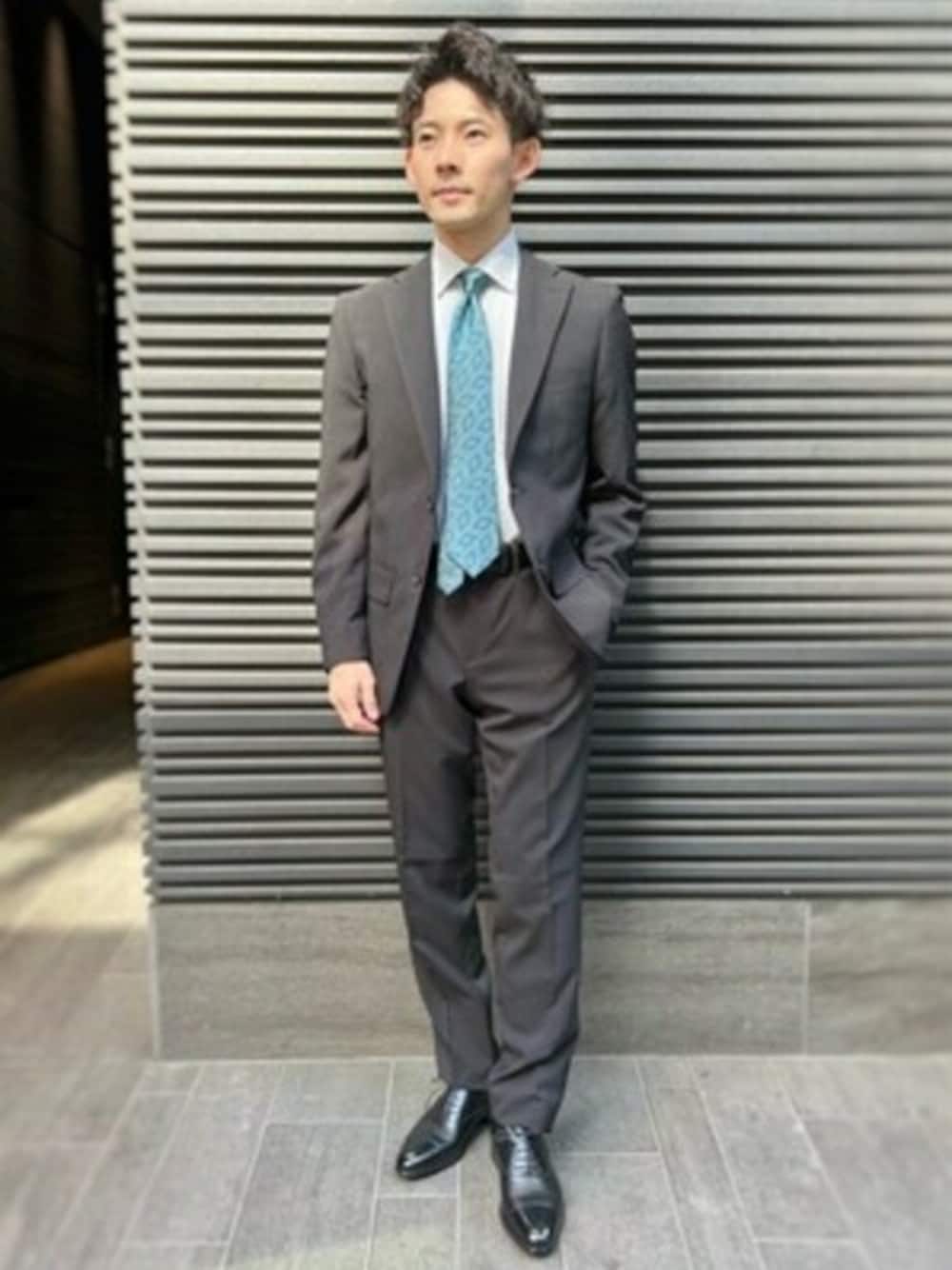 シンプルなブラックスーツには白シャツがベストですが 今回は遊び心を入れて、グレーのワイシャツとスモーキーグリーンのネクタイでコーディネートしました! ダークスーツがメインの方、ぜひオススメです◎ もちろん入学式や入社式にも♪ スタッフ着用 スーツY4 身長165cm 内田 本部
