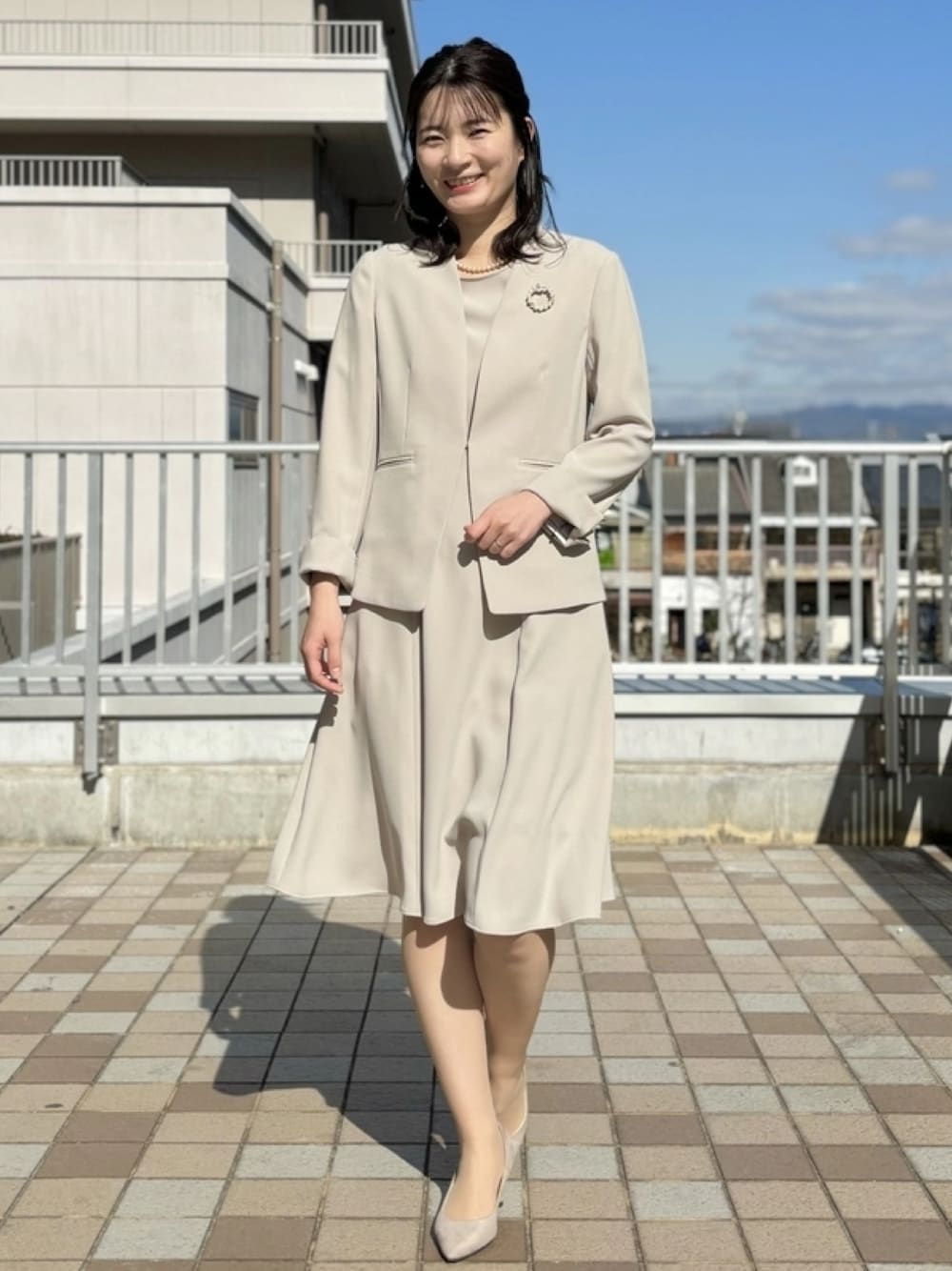 入園式・入学式ママコーデ☆ お祝いムードいっぱいの入園・入学式には 白やベージュの明るいカラーがオススメです♪ このワンピースは上半身はスッキリとしたデザインで ウエストからスソにかけては生地をたっぷりと使ったふんわりフレアスカートになっているので お尻や太ももが気になる方の体系カバーワンピとして調優秀です◎ スタッフ着用 ジャケットM ワンピースM 身長165cm てぃば PSFA尼崎店
