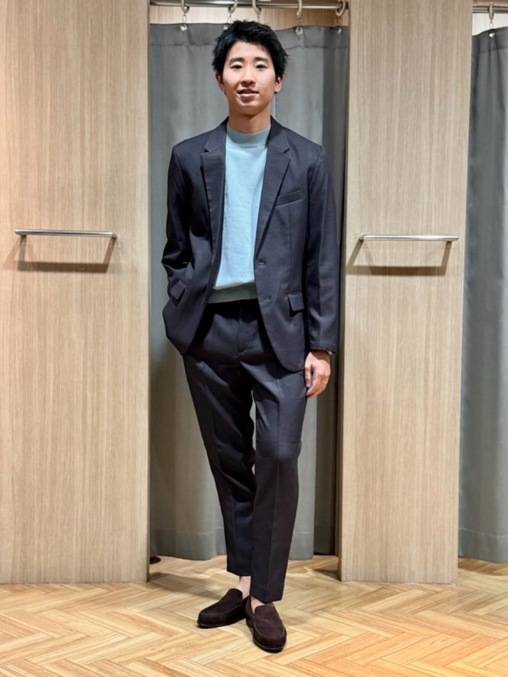 大人気の軽量プチプラセットアップチェックグレーを使った 春のコーディネートです! 軽くて、洗える、持ち運びがラクでプチプラ☆ 1着は持っておきたいですね♪ 今回はサックスのモックネックと合わせました。 明るい色なので春のコーディネートにピッタリ!! スタッフ着用 ジャケットL トップスM パンツL 身長176cm あぶらそば PSFA新宿東口店