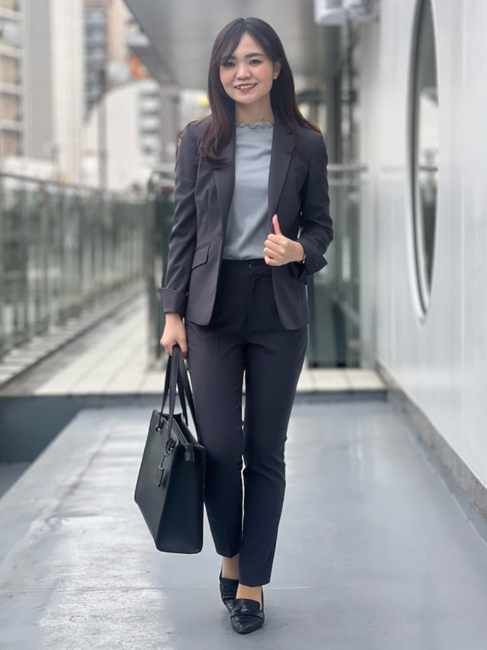 重すぎないほど良い深みのグレーのセットアップは 無地見えしますが、ほんのりミニチェック柄で 大人かわいいデザインです♡ 派手すぎないでのでかっちりシーンでも 着回ししやすくて万能ですよ♪ 今回はシックな大人セットアップに フリルが可愛いリブニットを合わせて 大人かわいいお仕事スタイリングにしました♡ スタッフ着用 ジャケット5号 パンツ5号 ニットS 身長157cm かっきー PSFAプラザ町田店