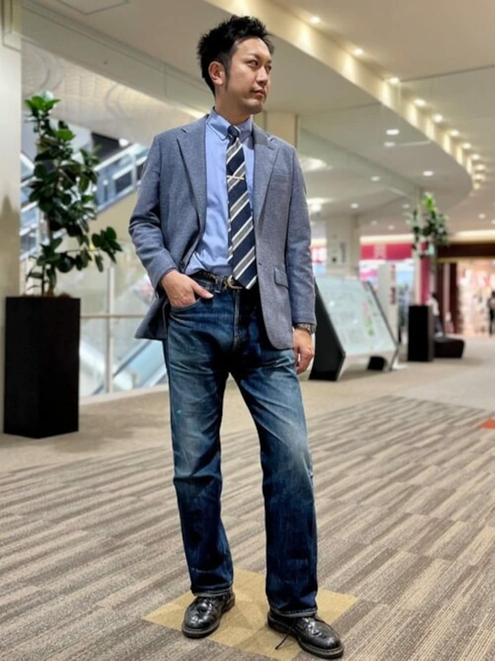 春夏ジャケットコーデ ブルーのジャケットにグレーのストライプネクタイとデニムを合わせました レノクロス高通気ジャケットは これからの季節にピッタリです! シャリ感のある素材と、通気性も抜群◎ どんなシャツやパンツとも好相性で、オンオフシーンを問わず使える万能アイテムです! スタッフ着用 ジャケットL 身長182㎝ BEN PSFA