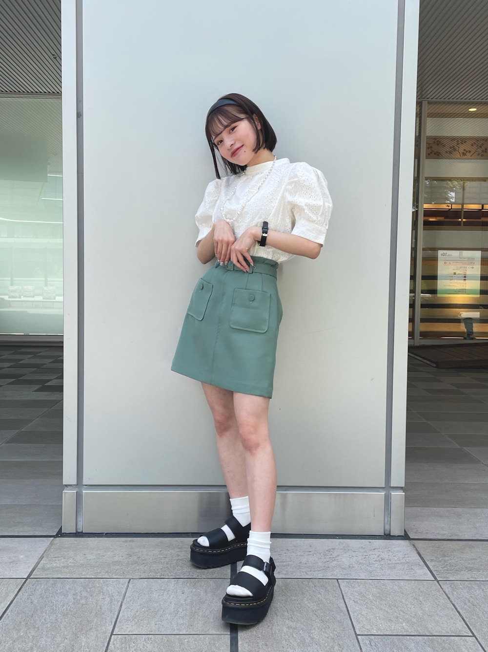 YUURI(FREE'S MARTルクア大阪)のシャツ/ブラウス「エンブロイダリーバックボタン半袖ブラウス」を使ったコーディネート
