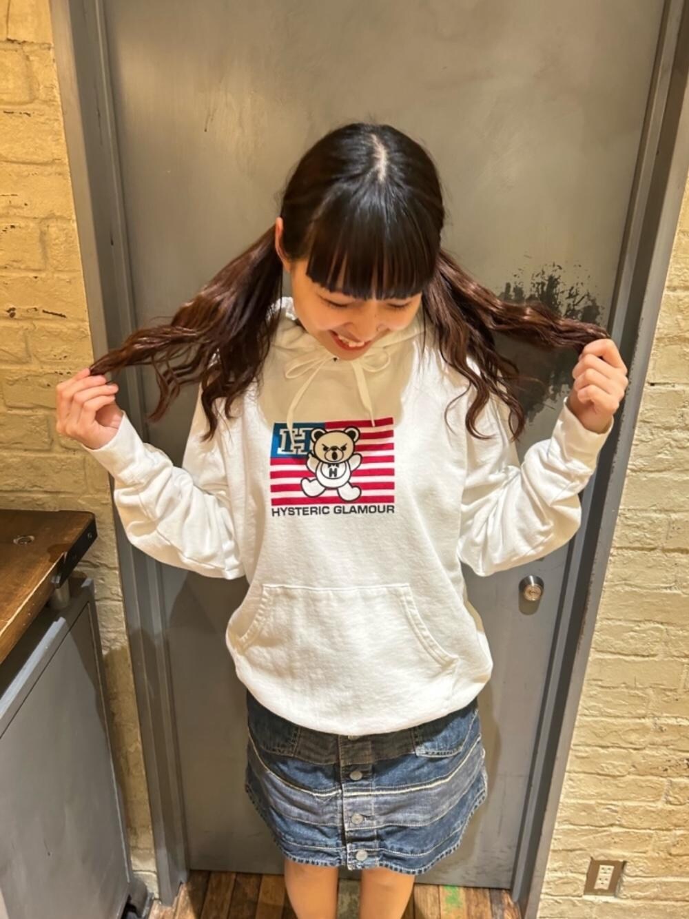 楓(HYSTERIC GLAMOURルクア大阪店)のデニムスカート「スクラッチAラインデニムミニスカート」を使ったコーディネート