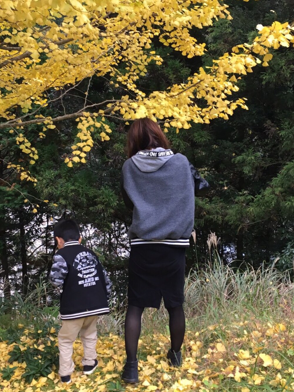 グレー系のスタジャン、ブラック系のスカートを着用したレディースの秋コーディネートの1枚目の写真