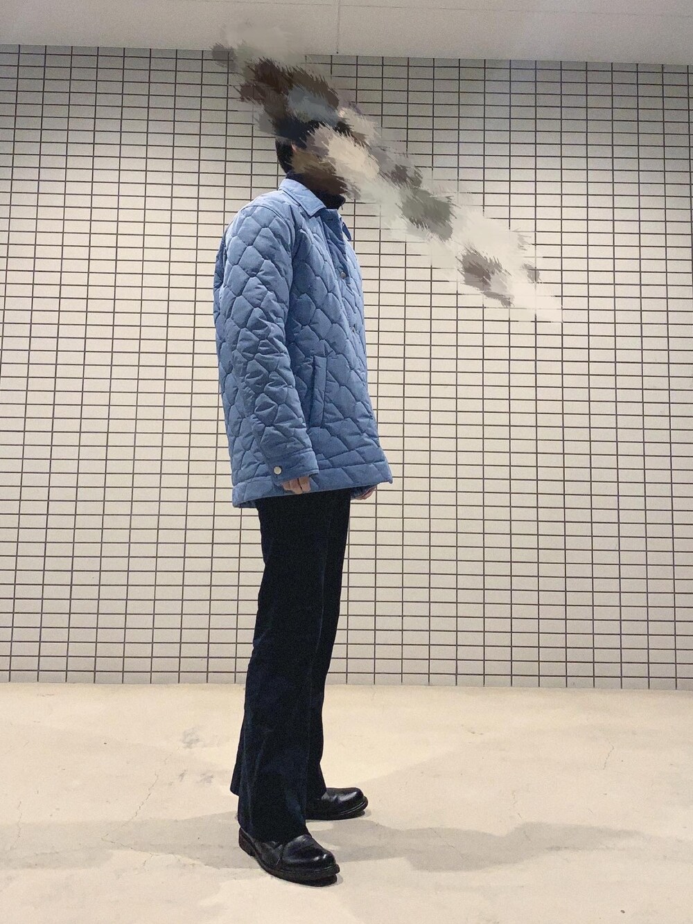 NOMIAのキルティングジャケットを主役に! わかりづらいですが、紺のインナー、濃紺のパンツとNOMIAの鮮やかな水色と同系色でまとめました👍🏻 ぼんやりしすぎないように、足元は黒の革靴で印象を引き締めます!