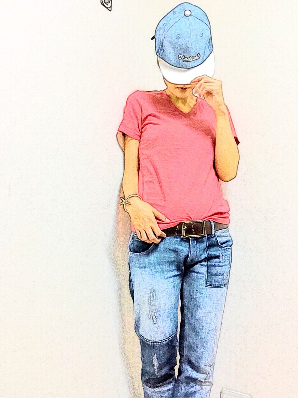 いつかの雨の日コーデ 🌂 どよ〜〜んした気持ちに喝‼️ 赤tee が気分をアゲてくれました😊 👚…glory crew ▷men's Sサイズ ▷Vネックの開き具合🙆 👖…ZARA ▷ゆったりだから履き心地👍 ▷デザインがツボすぎ💓 👒…WEGO ▷denim地に惚れ😍 ▷💙✖️ ♡ ハンカチ…ルプリュ(100円shop) ▷💛✖️ ♡のストライプが可愛💕 ▷ポッケからチラ見せがpoint😉