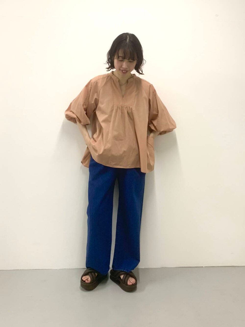 丸みのある袖口が可愛いブラウスは、165cmでお尻隠れる丈になります 首元のスキッパーデザインがすっきり見え綺麗です◎ デニムと合わしてみました ウエストはゴム仕様でとても楽チンで、程よいワイドシルエットで綺麗見えします 夏場でも締め付け感なく快適に着用できるのが嬉しいポイントです♪