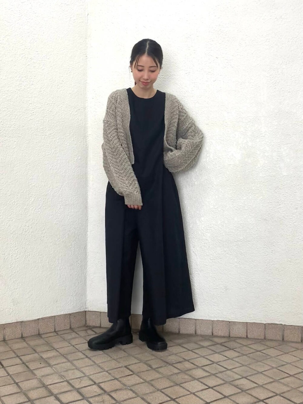 立体感のあるペルーニットカーディガン 165cmでお尻にかかる丈になります。袖周りや身幅にゆとりがありストレスなく着用できました ヘリンボン柄が存在感がありベーシックなものと合わせやすいです◎