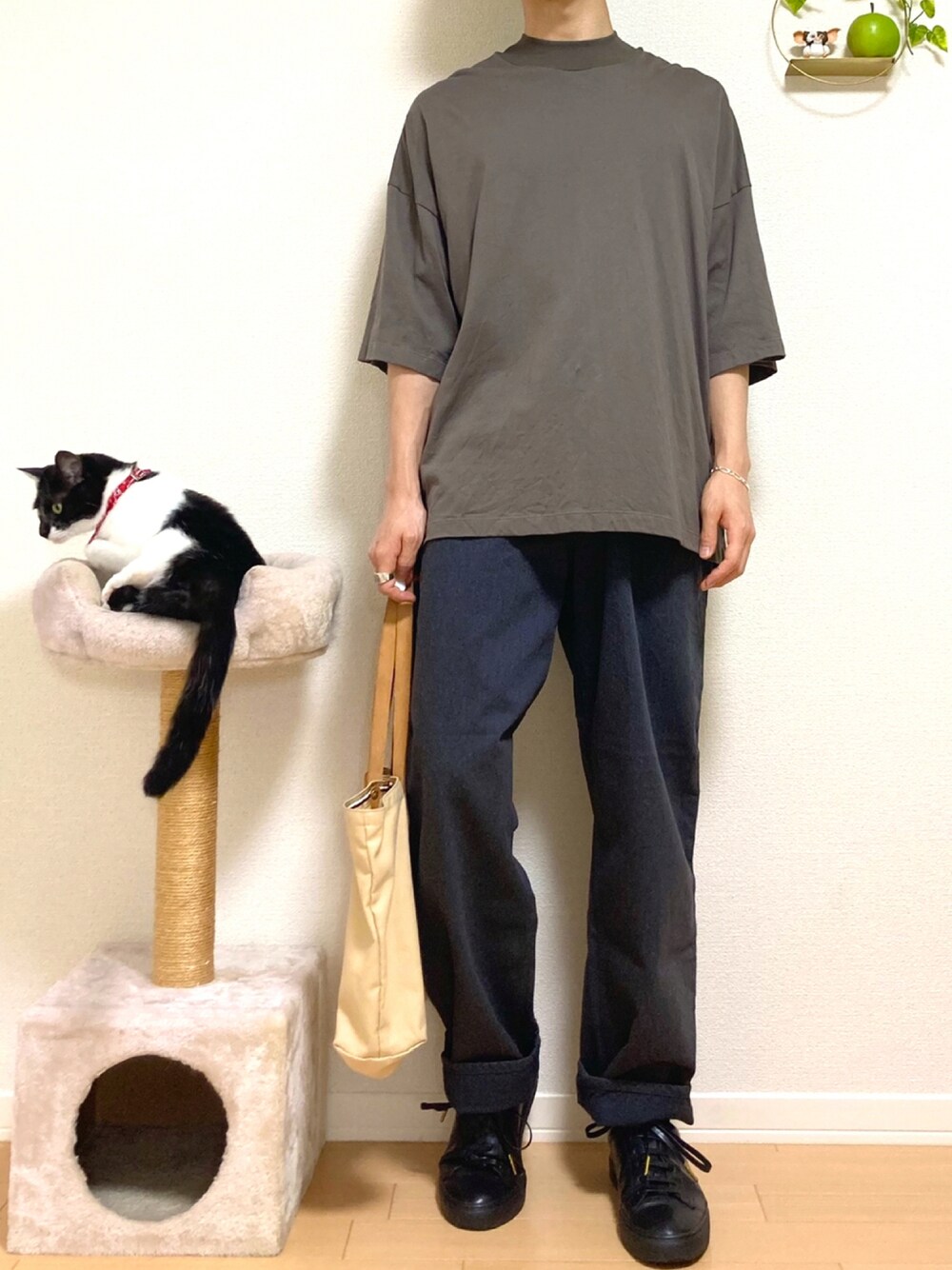 ビッグシルエットのモックネックTをメインに、グレーのデニムで落ち着いた色合わせにしてみました。 鞄とアクセサリーで少し明るさをプラス。 あと猫も追加してみました🐱