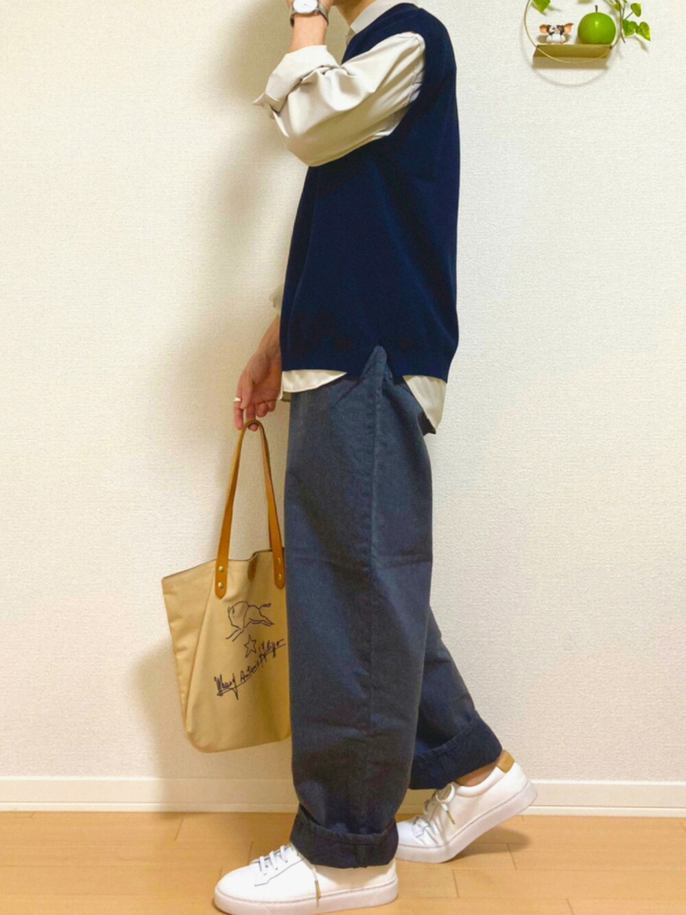 シャツにニットベストで鉄板きれいめコーデ! と見せかけてボトムはワイドデニムとスニーカー合わせてカジュアル寄りに。 デニムの横からのシルエットが◎ 昔はスキニーしか履かなかったのになぁ。 秋はアイテム数が多くなるので、考えるの大変だけど一番楽しい季節ですね♪