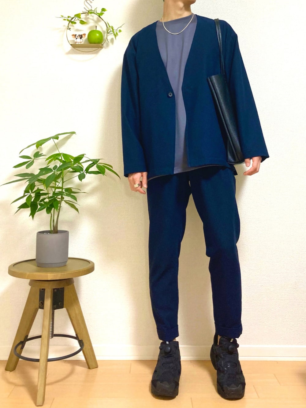 ノーカラーのセットアップスタイル。 Tシャツとスニーカーでラフさを出してます。 インナーのTシャツは、最近ヘビロテしてる着心地最高の一枚。 コットン100%なのにゴワゴワせず、光沢とドレープ感が素晴らしい。