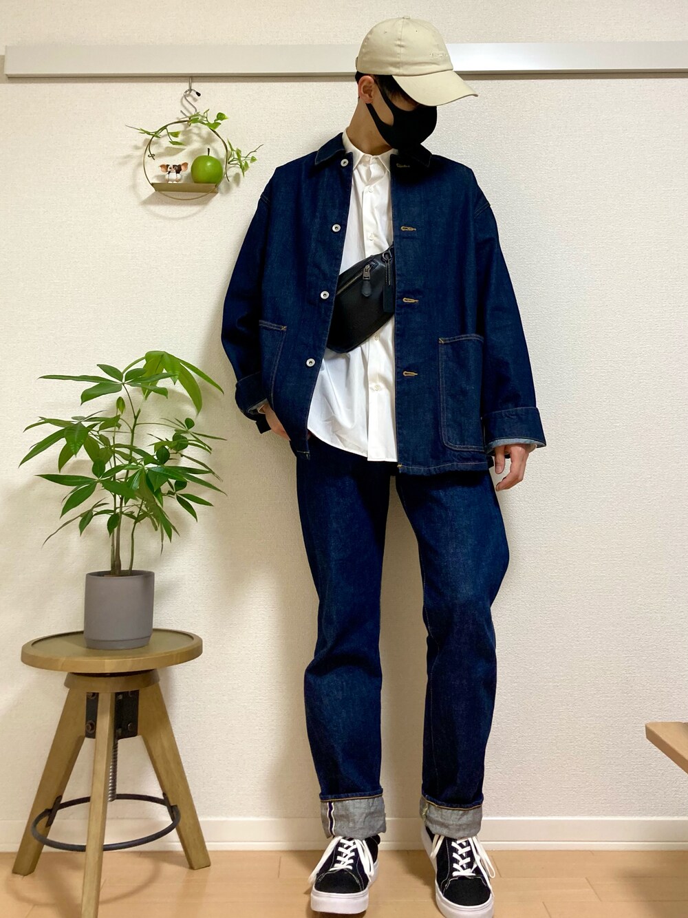珍しくデニムでセットアップ組んでみました! きれいめアイテムとして、レギュラーカラーの白シャツとレザーバッグをプラスしてます。