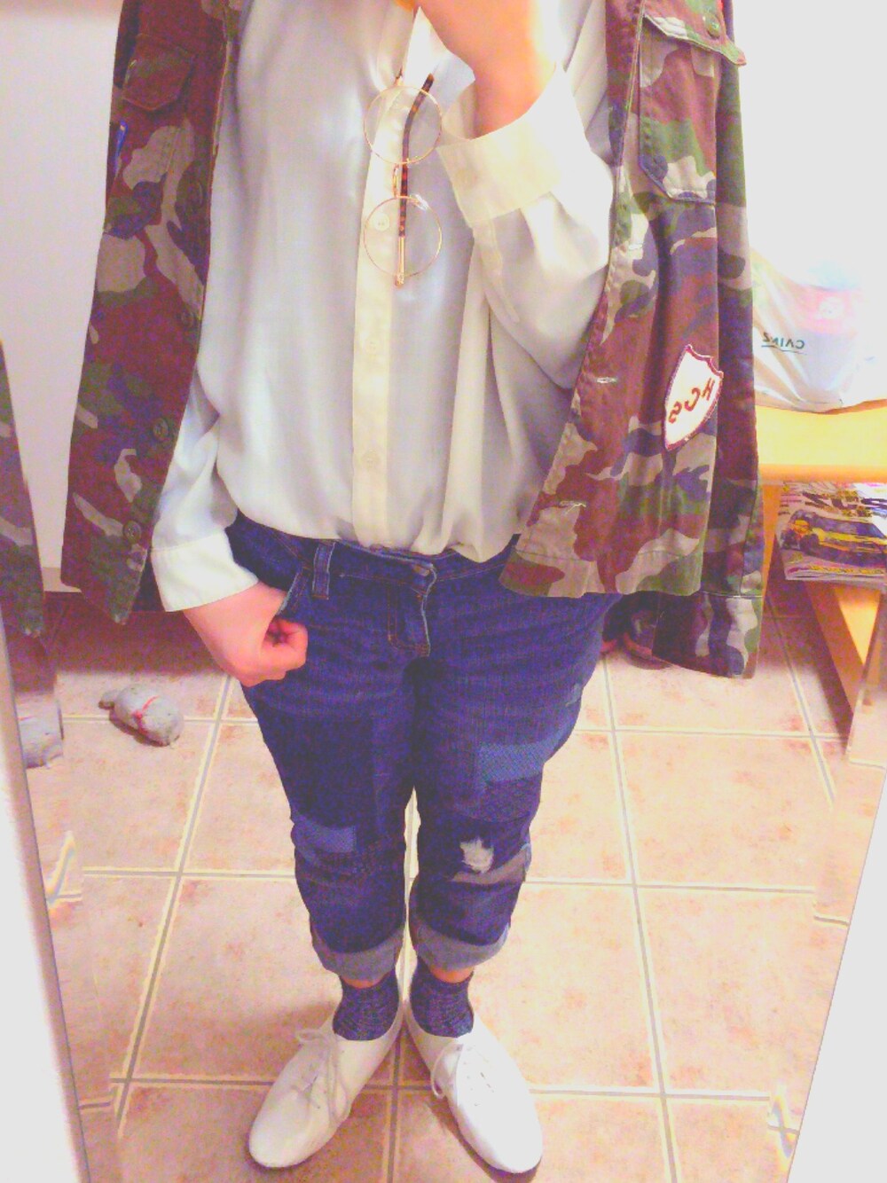 ブルー系のデニムパンツ、グリーン系のジャケット/アウターを着用したレディースの春コーディネートの1枚目の写真