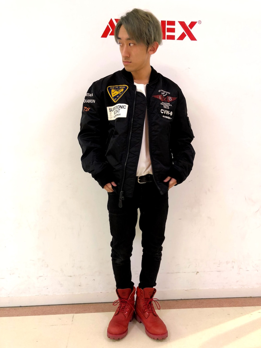 Lサイズ着用 中綿が入ってないMA-1になります これからの時期活躍する事間違いなしです 2018.02.11 AVIREXワールドポーターズ横浜店STYLE