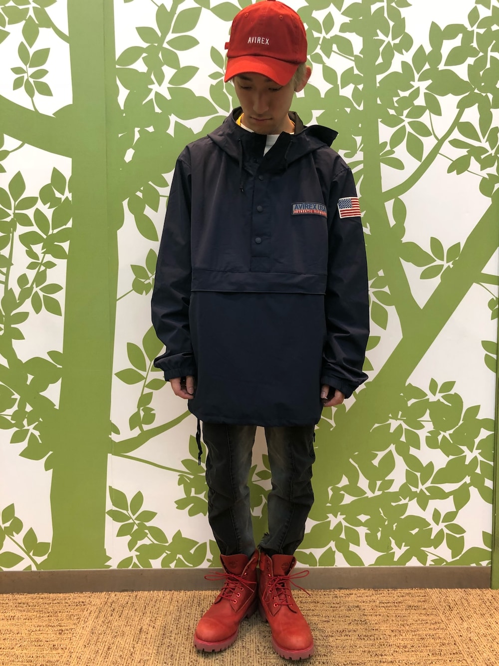 アノラックパーカーXLサイズ着用 パンツSサイズ着用 パーカーは大きめに着て、ブーツと帽子の赤をアクセントにしています 2018.03.11 AVIREXワールドポーターズ横浜店スタイル
