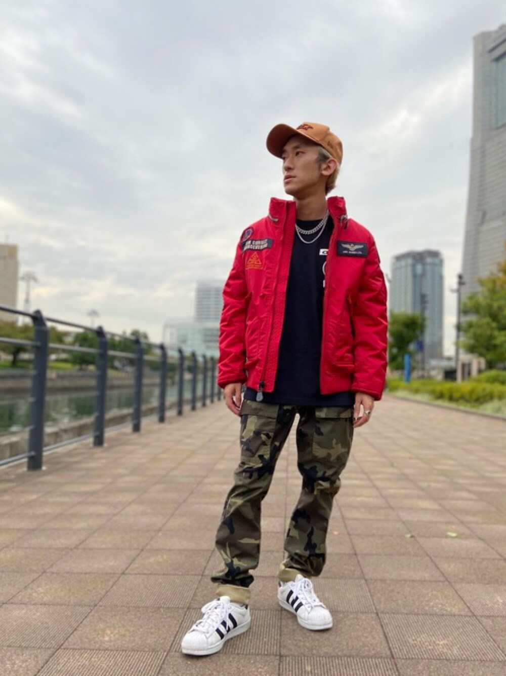 今年イチオシのTOP GUN CWUです! 赤に迷彩の組み合わせはおすすめです! 身長: 157cm 着用サイズ: CWU/M インナー/M パンツ/S