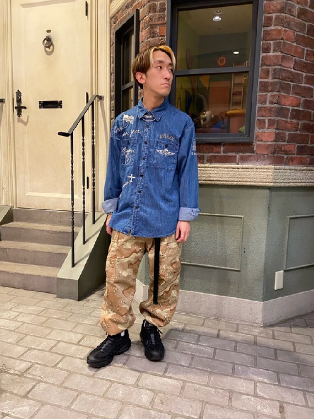 刺繍のデニムシャツに迷彩パンツを合わせてみました! パンツは裾が絞れるようになっているのでスニーカー好きな人にもおすすめ! 着用サイズ: シャツ/M パンツ/S