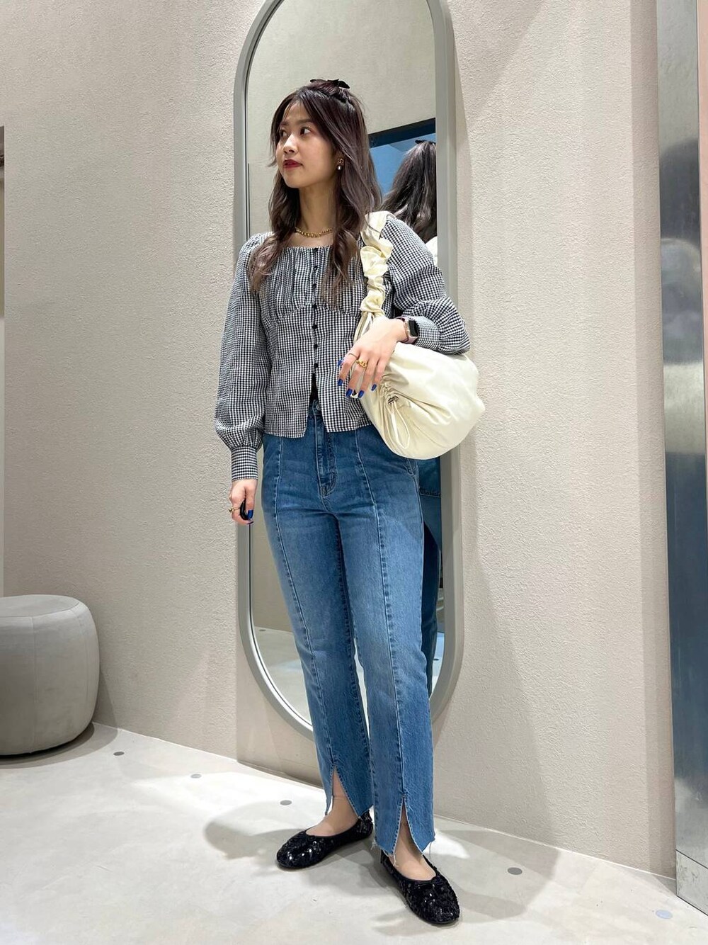 春らしいブラウスを使ったスタイリングです! ハイウエストな位置で切り替えになるので、すっきりした印象でご着用頂けますo(^_^)o🩵🩵 もご覧頂けると嬉しいです!