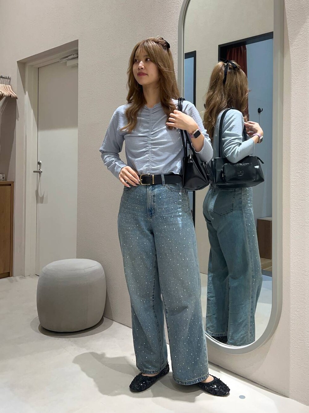 ご覧頂きありがとうございます🌠 こちらは先日の店頭コーディネートです🫧 トップスは前後2wayになっており、ブラウス素材になっているので、今の時期に着用して頂きやすいです🤍 ビジューデニムも新色が追加され、3色どれもあまりないデザインで、シンプルな合わせでも映えるスタイリングが出来ます👶🏻💝 も毎日更新中〜(^_^)❕❕ 良かったらご覧頂けると嬉しいです🫧