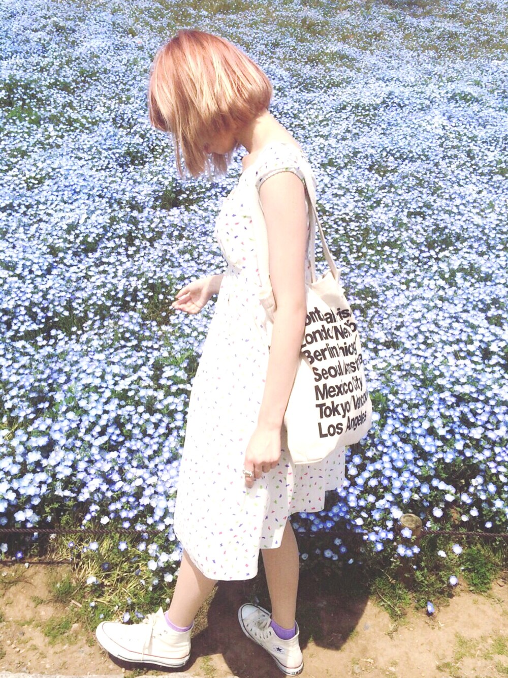 今年の夏ネモフィラ畑💠 この頃はボブハイトーンだから今と系統が違う 髪型と髪色で服の系統が変わるものです☺️