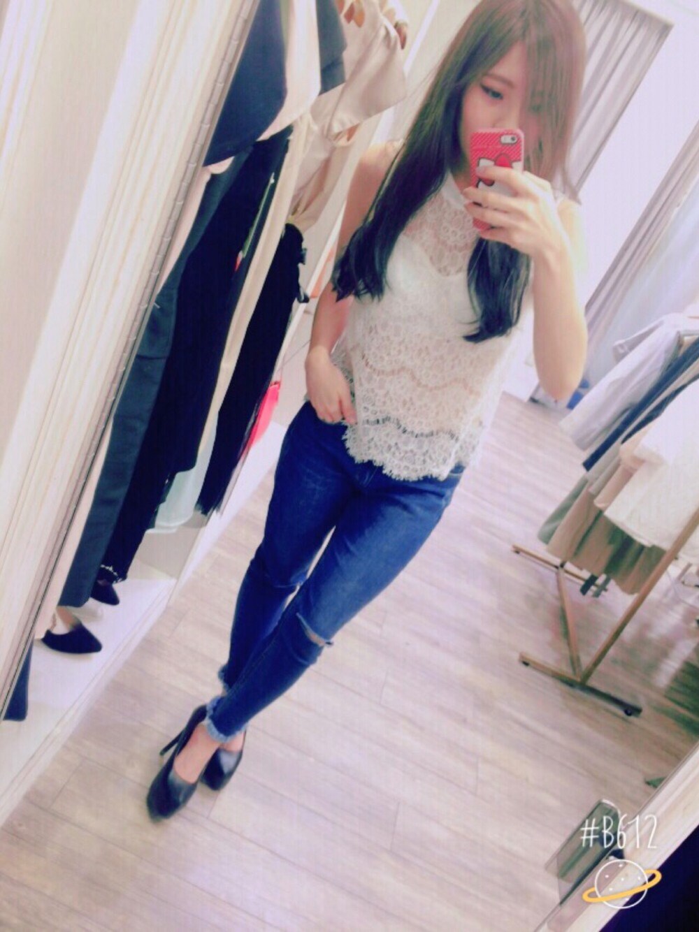 トップスは本当は裏地があるんですが半分から切ってお腹の部分が透けるようにしました😂✌